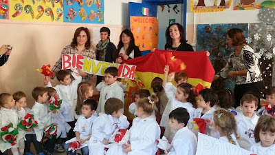 Así recibieron los niños del colegio I Circolo Didattico "G. Falcone" de Conversano (Italia) a Rosalia, Carolina y Ana Isabel. Se les ve muy contentos.
